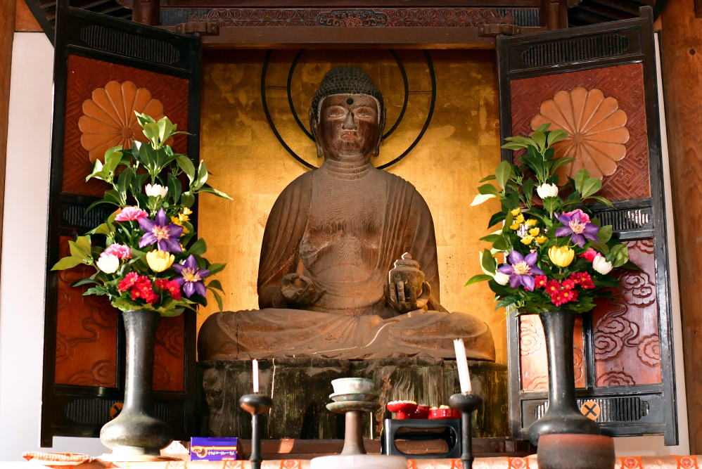 両手は薬師の印に補作されているが、肱の形から、元は定印を結ぶ阿弥陀如来であったものと推測。