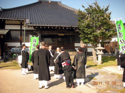 日蓮宗妙蓮寺本堂前にて出発諷経