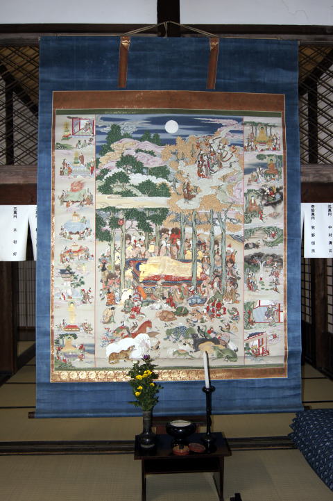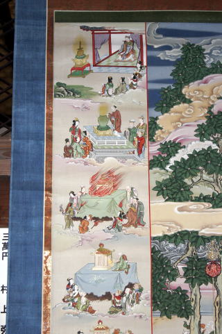 右上部には荼毘に付され、舎利塔に分骨され礼拝されている場面で結ばれている。