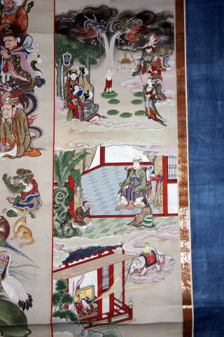 左下部には都率天から白象に乗って摩耶夫人胎内に入っていく場面が描かれ、